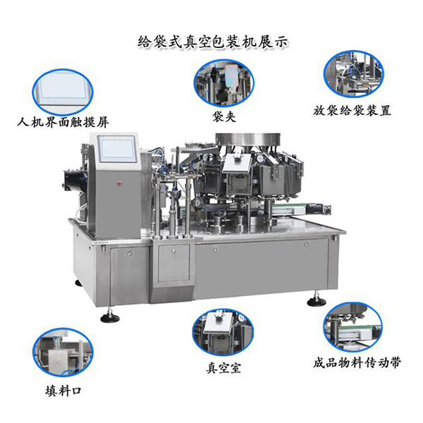 1、全自動(dòng)旋轉(zhuǎn)式給袋真空包裝機(jī)由兩種分離的旋轉(zhuǎn)式機(jī)體組成(分別為充填系統(tǒng)和真空系統(tǒng));